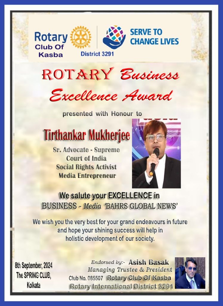 সামাজিক-সাংস্কৃতিক অনুপ্রেরণামূলক উদ্যোগে তার সর্বাত্মক শ্রেষ্ঠত্বের জন্য, তীর্থঙ্কর মুখোপাধ্যায় সম্প্রতি রোটারি ক্লাব অফ কসবা থেকে রোটারি এক্সিলেন্স অ্যাওয়ার্ডে ভূষিত হয়েছেন। 8 ই সেপ্টেম্বর প্রাক্কালে দ্য স্প্রিং ক্লাবে রোটারির সভাপতি এবং সামাজিক প্রভাবশালী আশিস বসাক আয়োজিত একটি জমকালো অনুষ্ঠানের সময় তীর্থঙ্কর মুখার্জিকে পুরস্কারটি প্রদান করা হয়।