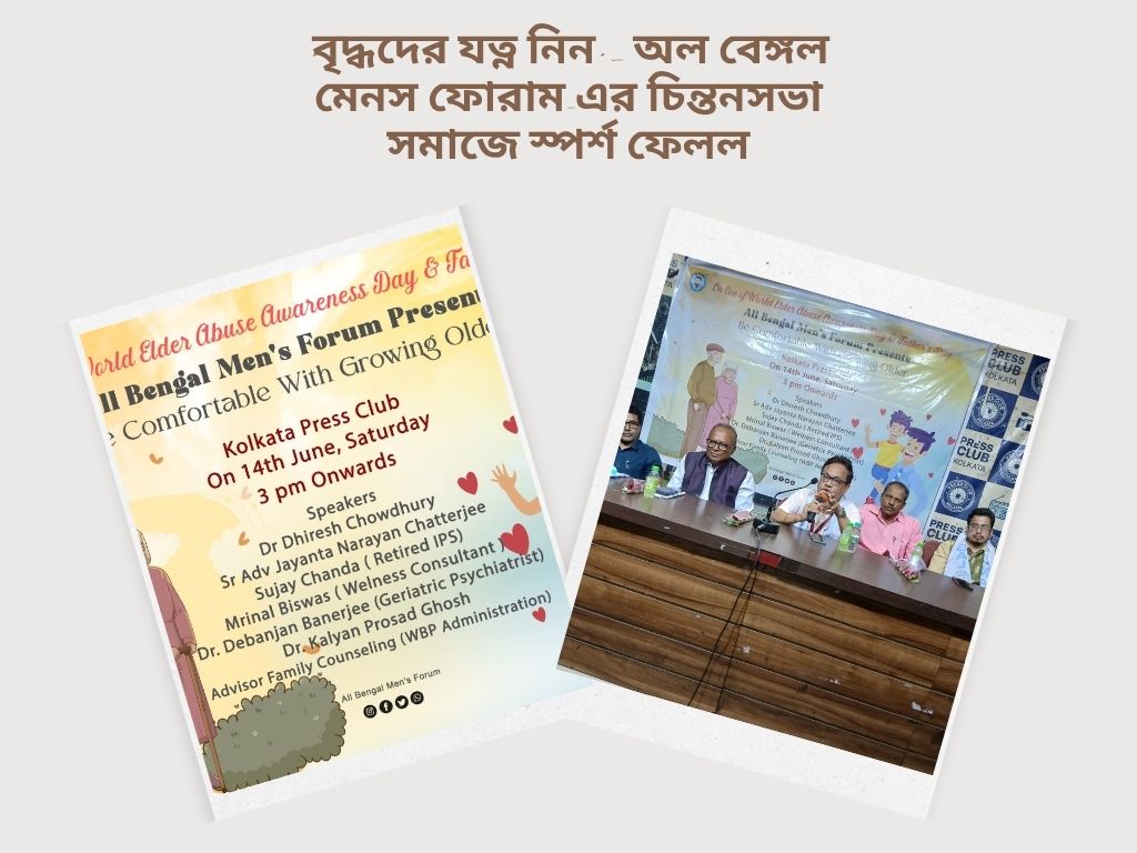 বিশ্ব বয়স্ক নির্যাতন সচেতনতা দিবস এবং বাবা দিবসের প্রাক্কালে, অল বেঙ্গল মেনস ফোরাম (ABMF) একটি মর্মস্পর্শী আলোচনাসভা আয়োজন করে — যার নাম ছিল “বৃদ্ধদের যত্ন নিন”। এই উদ্যোগের মাধ্যমে শুরু হল এক নতুন সামাজিক ভাবনার — “বয়স্কদের সাথে আরামদায়ক হোন” — যা সমাজে বয়স্ক নাগরিকদের প্রতি সহমর্মিতা ও দায়িত্ববোধের বার্তা বহন করে।