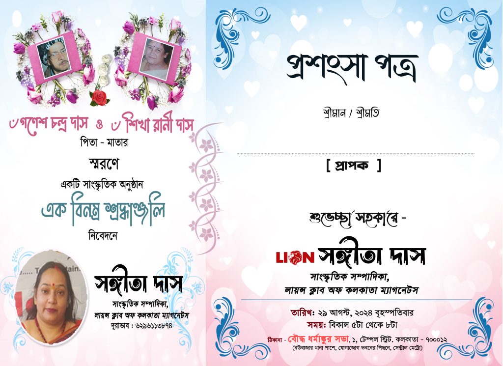 লায়ন সঙ্গীতা দাস, প্রতিভাবান কবি ও গায়ক এবং মাননীয় ড. LIONS CLUB OF MAGNATES-এর সাংস্কৃতিক সম্পাদক, বৌদ্ধ ধর্মাঙ্কুর সভাতে 29শে আগস্ট প্রাক্কালে তার প্রিয় বাবা-মায়ের স্মরণে একটি সাংস্কৃতিক অনুষ্ঠানের আয়োজন করেছিলেন।