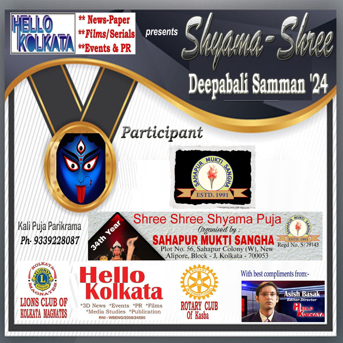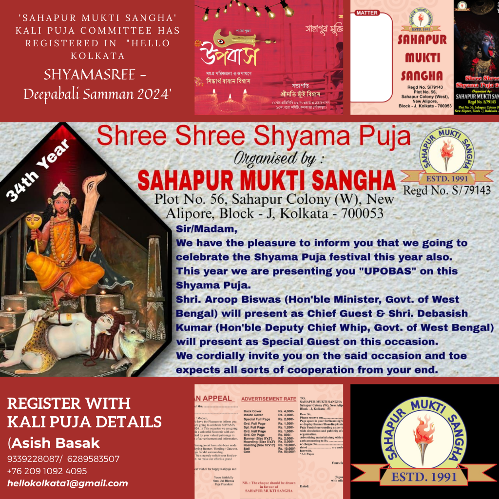 ‘সাহাপুর মুক্তি সংঘ’ কালী পূজা কমিটি “হ্যালো কলকাতা শ্যামাশ্রী – দীপাবলি সম্মান 2024”-এ নিবন্ধন করেছে, আমাদের কালী পূজা পরিক্রমার 17তম বছরে’