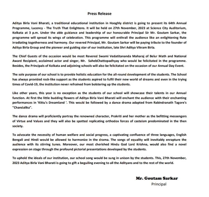 দূরবর্তী মফস্বল শহর রিষড়ায় অবস্থিত আদিত্য বিড়লা বাণীভারতী শিক্ষাপ্রতিষ্ঠানের ছাত্র-ছাত্রীদের কলকাতার সাইন্সসিটির প্রেক্ষাগৃহে বার্ষিক অনুষ্ঠানপালন কিভাবে সম্ভবপর হয়ে ওঠে তা মাননীয় অধ্যক্ষ মহাশয়ের বার্ষিক প্রতিবেদন নিবিড়ভাবে অনুধাবন করলেই বুঝতে পারা যায়। পড়ুয়াদের সর্বাঙ্গীণ বিকাশোপযোগী শিক্ষা পরিবেশ