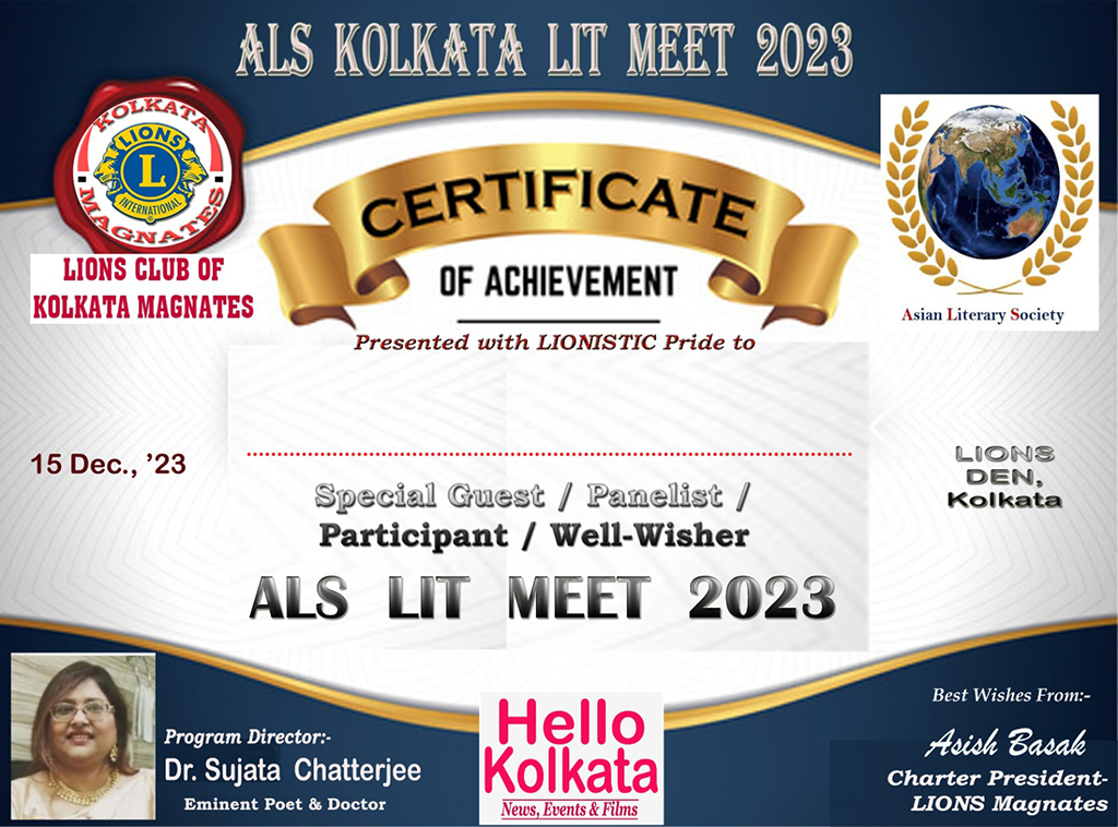 “এ এল এস কলকাতা সাহিত্য সভা ২০২৩” লায়ন্স ক্লাব অফ কলকাতা ম্যাগনেটস এবং হ্যালো কলকাতা (৩ডি নিউস-মিডিয়া, পি আর, ইভেন্টস ও ফিল্মস ) দ্বারা সমর্থিত ছিল। ১৫ ডিসেম্বর প্রাক্কালে কলকাতার লায়ন্স ডান -এ মর্যাদাপূর্ণ সভা অনুষ্ঠিত হয়েছিল।