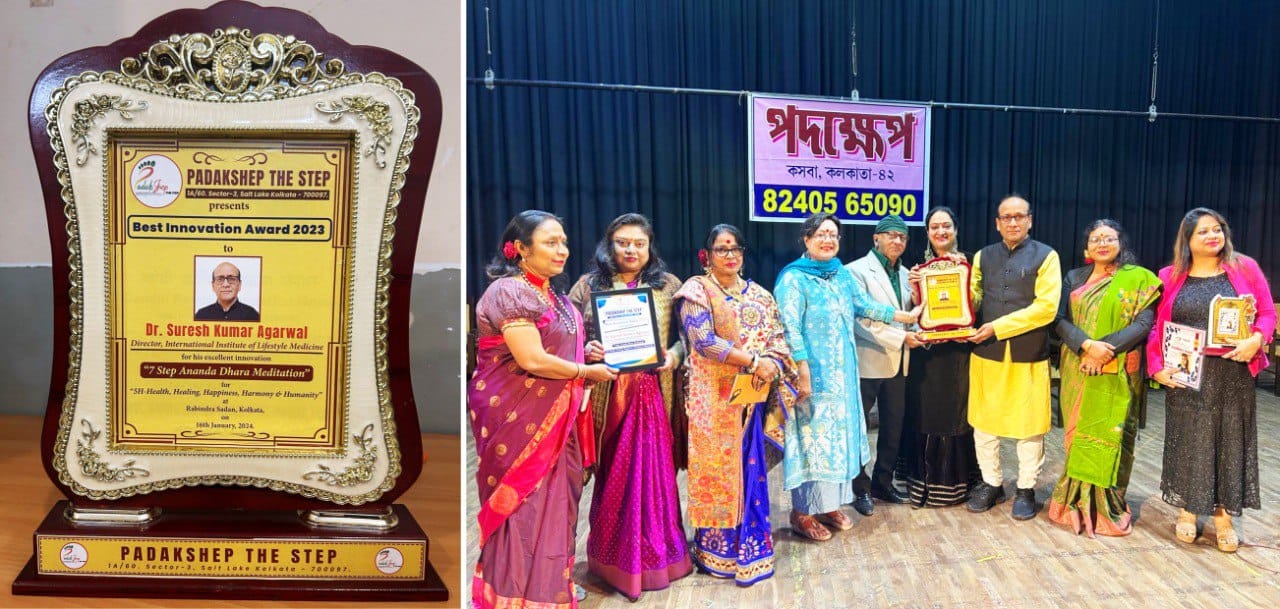 ডঃ সুরেশ কুমার আগরওয়াল, ডিরেক্টর ইন্টারন্যাশনাল ইনস্টিটিউট অফ লাইফস্টাইল মেডিসিন, তার অসামান্য উদ্ভাবন এবং মেডিটেশনের ক্ষেত্রে অবদানের স্বীকৃতিস্বরূপ কলকাতার “পদক্ষেপ দ্য স্টেপ” রবীন্দ্র সদনে 7 ধাপ আনন্দ ধারা মেডিটেশনের জন্য সেরা উদ্ভাবন পুরস্কার 2023-এ ভূষিত হয়েছেন।