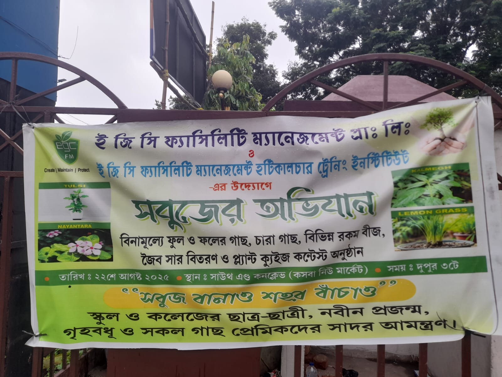 EGC ফ্যাসিলিটি ম্যানেজমেন্ট প্রাইভেট লিমিটেড এবং EGC FM হর্টিকালচার ট্রেনিং ইনস্টিটিউট পূর্ববর্তী বছরের মতো তাদের GO GREEN MOVEMENT, একটি মিশনারি গ্রিন প্রচারণা, যা প্রতিটি বাড়িতে উদ্যানপালন পৌঁছে দেওয়ার এবং শহরকে আরও সবুজ ও স্বাস্থ্যকর করে তোলার লক্ষ্যে ২২শে আগস্ট, ২০২৫ তারিখে সাউথএন্ড কনক্লেভ (কসবা নিউ মার্কেট) এ একটি বিনামূল্যে উদ্ভিদ বিতরণ অনুষ্ঠানের আয়োজন করে।