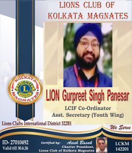 Gurpreet Singh Panesar, a young dynamic social worker is currently elected as the LCIF Co-Ordinator & Assistant Secretary (Youth Wing) of Lions Club of Kolkata MAGNATES, Dist. 322B1, LIONS Clubs International, India.