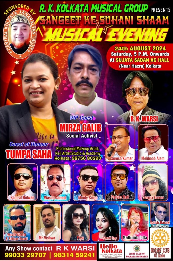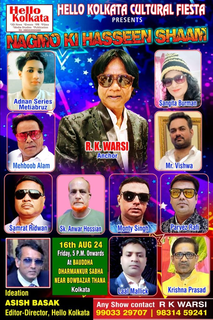 হ্যালো কলকাতা মিউজিক্যাল ফিয়েস্তা 16ই আগস্ট বিডিএস হলে জনপ্রিয় উপস্থাপক আর কে ওয়ার্সি আয়োজিত হয়েছিল।